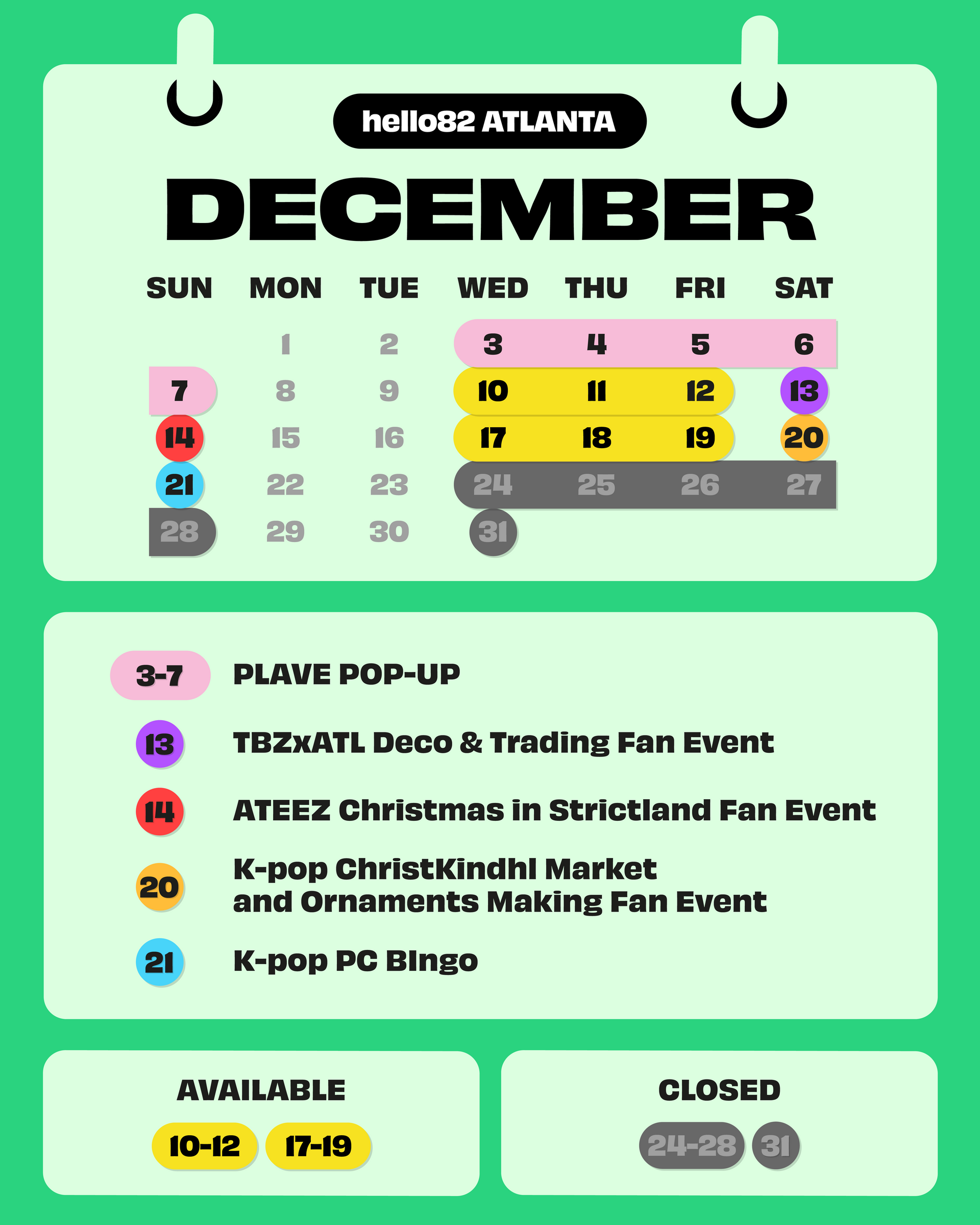 Fill out the form below to reserve the hello82 ATLANTA space to celebrate your idol's birthday's, anniversaries, comebacks, etc. with cupsleeve events, watch parties, and more!